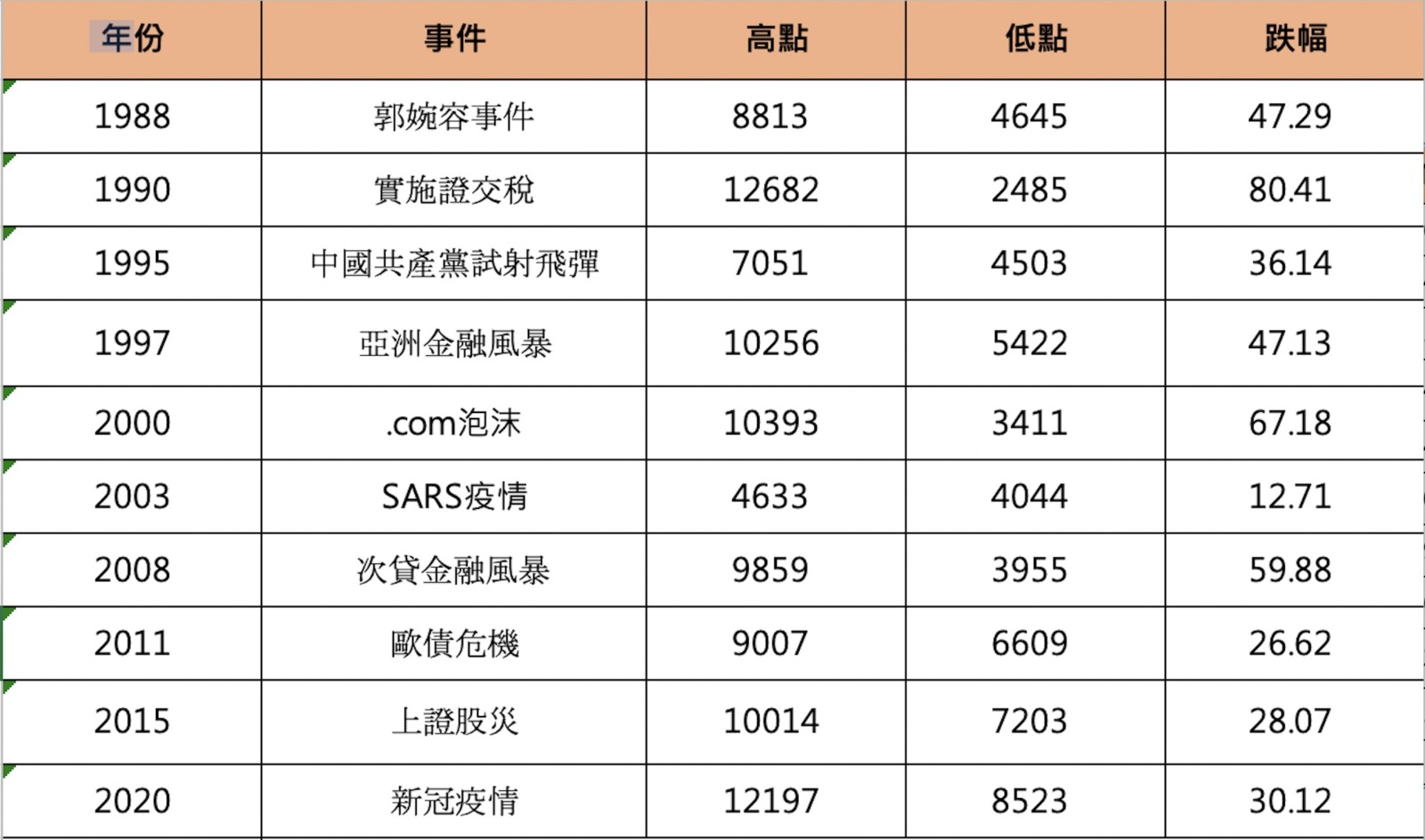 - 第一種是系統性風險導致的長年經濟衰退,比如 1929 經濟大恐慌、1970 停滯通膨、2008 年次貸風暴,這種跌幅可能會來到五成;第二種是正常庫存週期的景氣循環,類似 2011 年、2015 年、2018 年,這種自然景氣下跌跌幅會大概兩成到三成左右;第三種是特殊事件的衰退,比如 2003 年的 SARS 和 2020 年新冠疫情,跌深後往往會快速反彈。