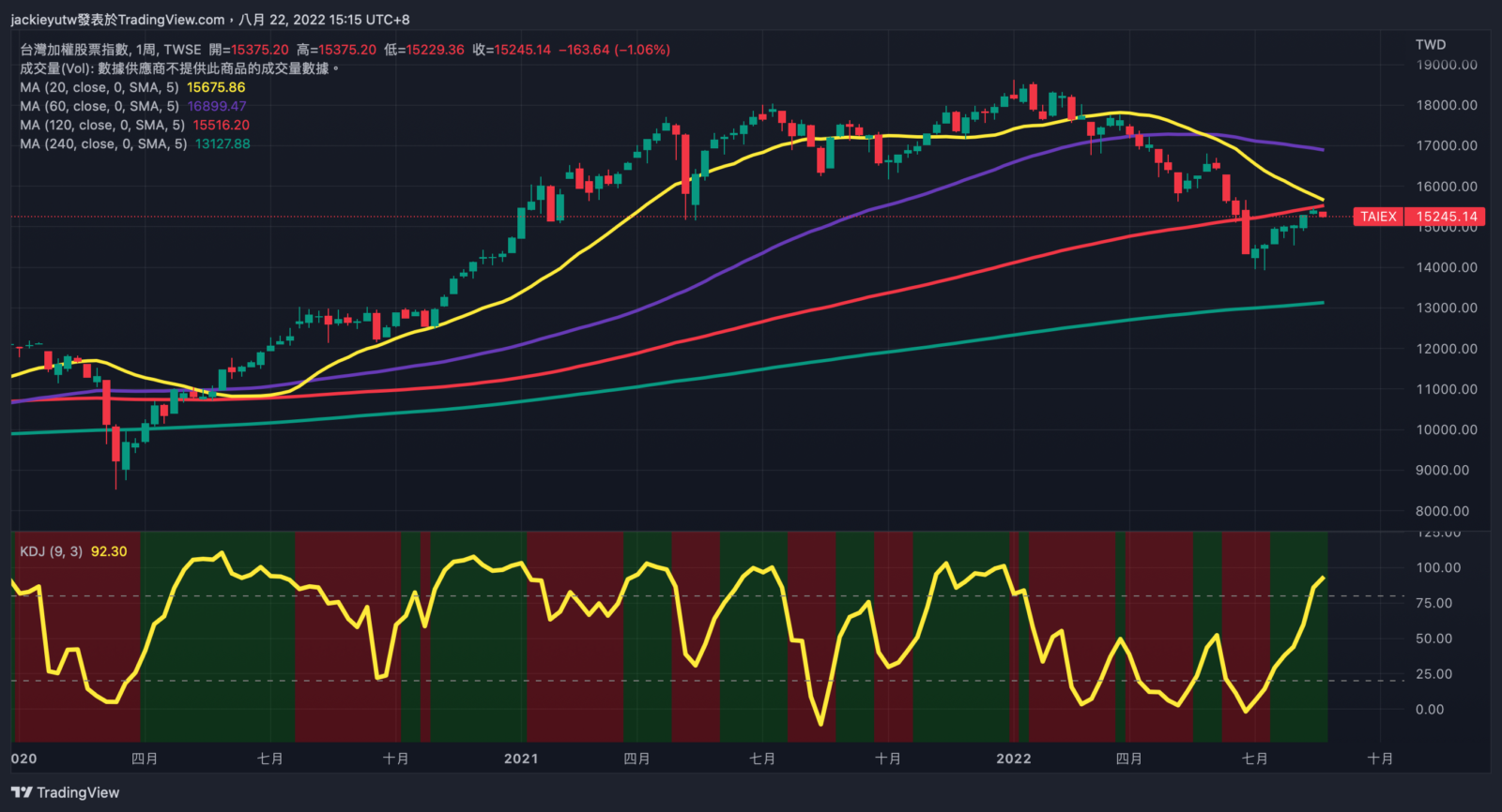 - 本輪反彈終於迎來回檔,過去一週,道瓊週跌幅 0.16%,標普週跌 1.21%,那指週跌 2.62%,費半週跌 3.73%,七月的反彈陸續受到年線賣壓,我認為這是好事,今年股市績效約下滑至 +5%,過去一個月持有比例沒有太大變動,81% 持有資產,19% 為現金,今年現金投入比例超過六成 (去年現金佔總資產為五成,目前為 19%),九月份我會重新統計每個月實體資產比例,現金有可能會升高一些,因為八月有許多到帳的現金股利。