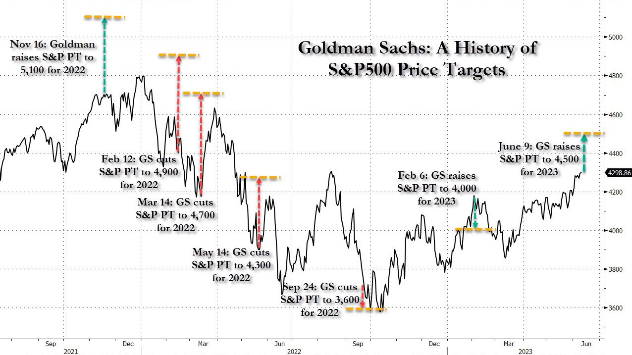 - 甚至,投行也被嘎到受不了。過去我們追蹤,今年年初,美國五大投行的標普 500 目標價,小摩最樂觀僅估 4200 點,美銀、高盛 4000 點,花旗、大摩 3900 點,如今標普逼近 4300 點,遠高於投行在年底的目標價,高盛開始認輸,將標普目標從 4000 上調至 4500,附圖是高盛預測的標準普爾價格目標的歷史,一旦市場進入全面追價,股市短期的拉升也將迎來拐點。