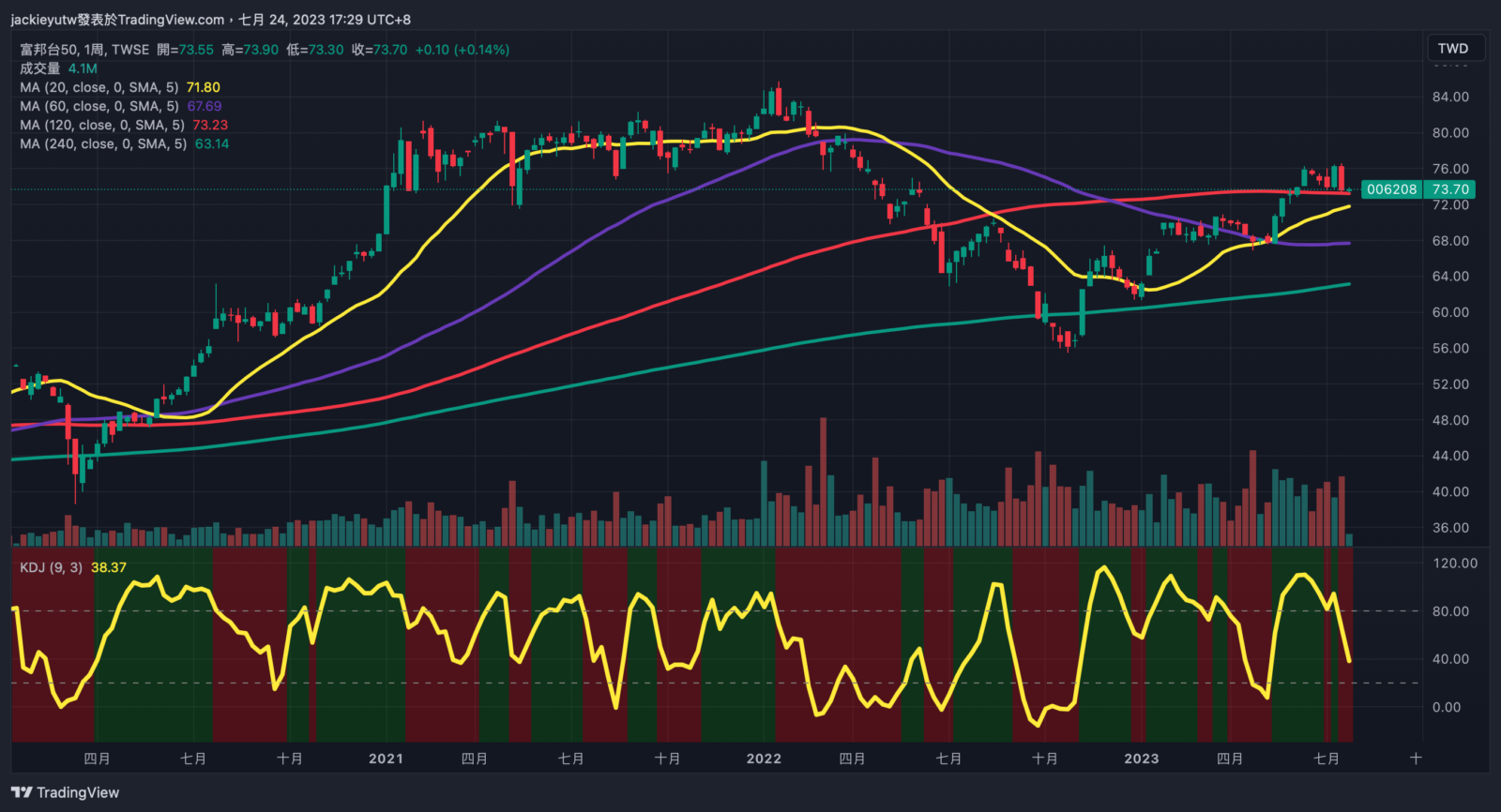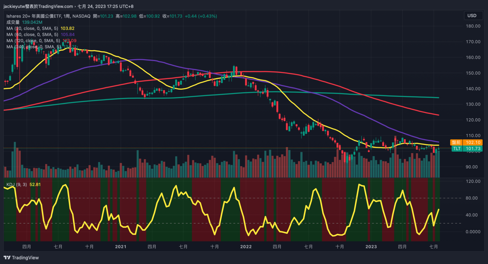 - 我持有的 TLT 已經築底一段時間了,乖離也逐步打底,目前按照市場預估,九月可能會暫停升息,並預估在明年 Q1~Q2 進入預防性降息,不過,按照當前的景氣復甦與數據,我倒沒有那麼樂觀的看待債券的上漲行情,目前核心通膨仍高,聯準會很有可能會保持在高利率停看聽,債券在近期比較有機會築底成功,但要在明年上半年大漲還是有點難度,投資眼光還是得放遠一點。