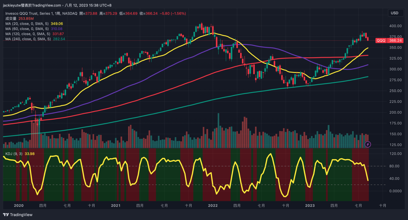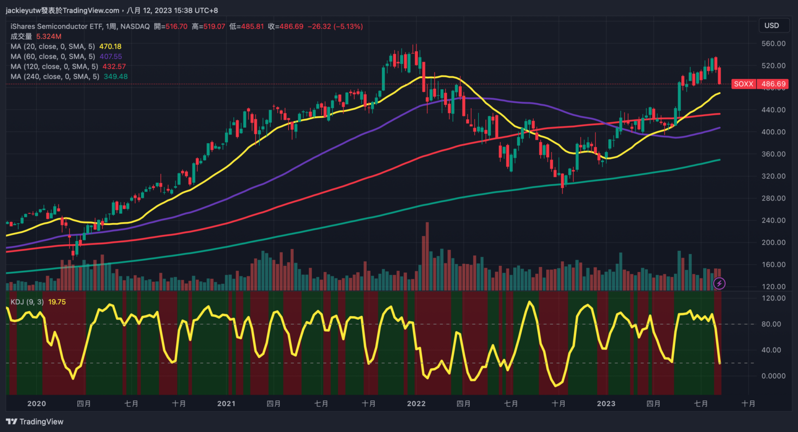 - 美股本週持續回檔,目前,追蹤費半的 SOXX 周乖離已進入低檔區,我於上週開始佈建,那指 QQQ 部分,雖有回調,但乖離仍有 33,如果接下來一週股價持續回檔,就會有佈建機會。事實上,美股今年來幾乎沒有看到自然的乖離回檔,按照過去經驗,一年至少要有兩次週乖離回檔機會,如今終於發生,終於有機會,把過去幾個季度不斷上升的現金水位給壓下來。