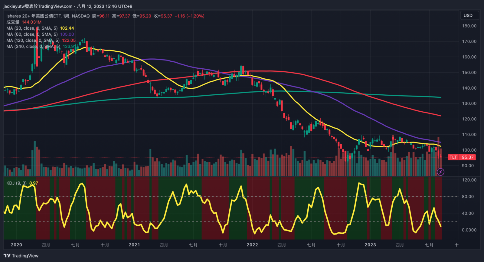 - 這段時間隨著經濟數據陸續轉好,市場終於意識到今年似乎難以進入衰退,使利率政策難以進入到下行循環,這讓債券在過去一週持續測底,我持有的 TLT 已經逼近前低,我仍然持續佈局中。不過,即便經濟數據慢慢變好,不代表聯準會有在大幅升息的空間在,按照過去幾個月的 FOMC 基調,聯準會的態度更像是以拖待變,不再釋放高強度升息的訊號,而是以時間換取空間,讓通膨為基期效果自然退卻後,在考慮是降息的機會。