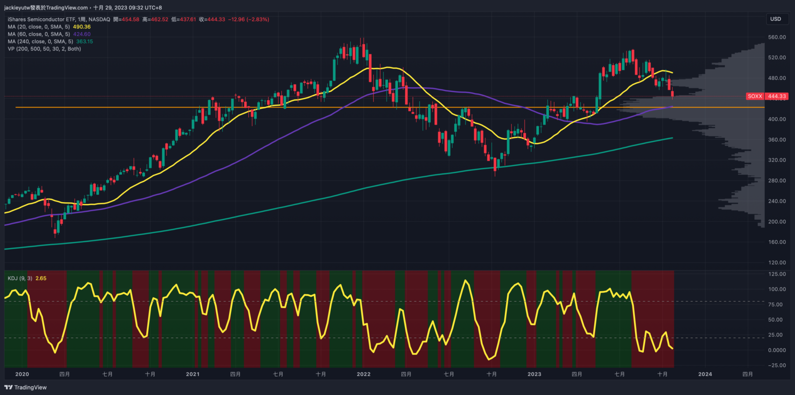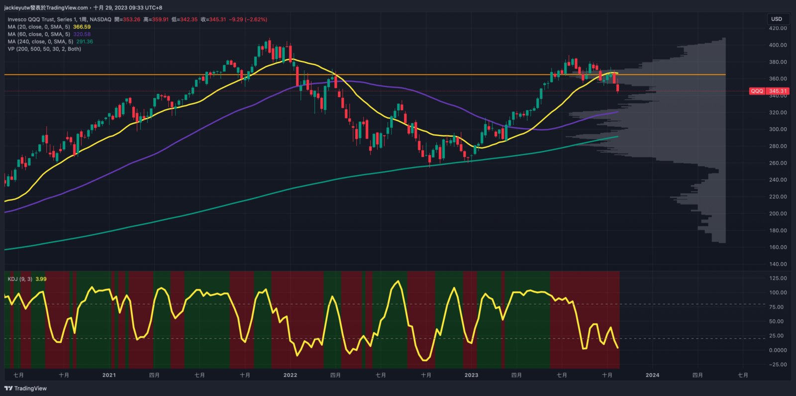 - 以我持有的 QQQ 來看,可以清楚過去一年,市場的買盤主要集中在 3 個區塊,分別為 360 元、320 元與 300 元,這三大區塊是過去一年投資人的重要成本價,在還未跌破前有重要的心理關卡作用,目前 360 已經由支撐轉為賣壓,未來就要看 320 元與 300 元的支撐效果,當然,價格是做出來的,經常出現破底翻等現象,我認為只要依循週期,選擇在景氣低位階、乖離低位階的時間進行佈建,就不會有太大問題。