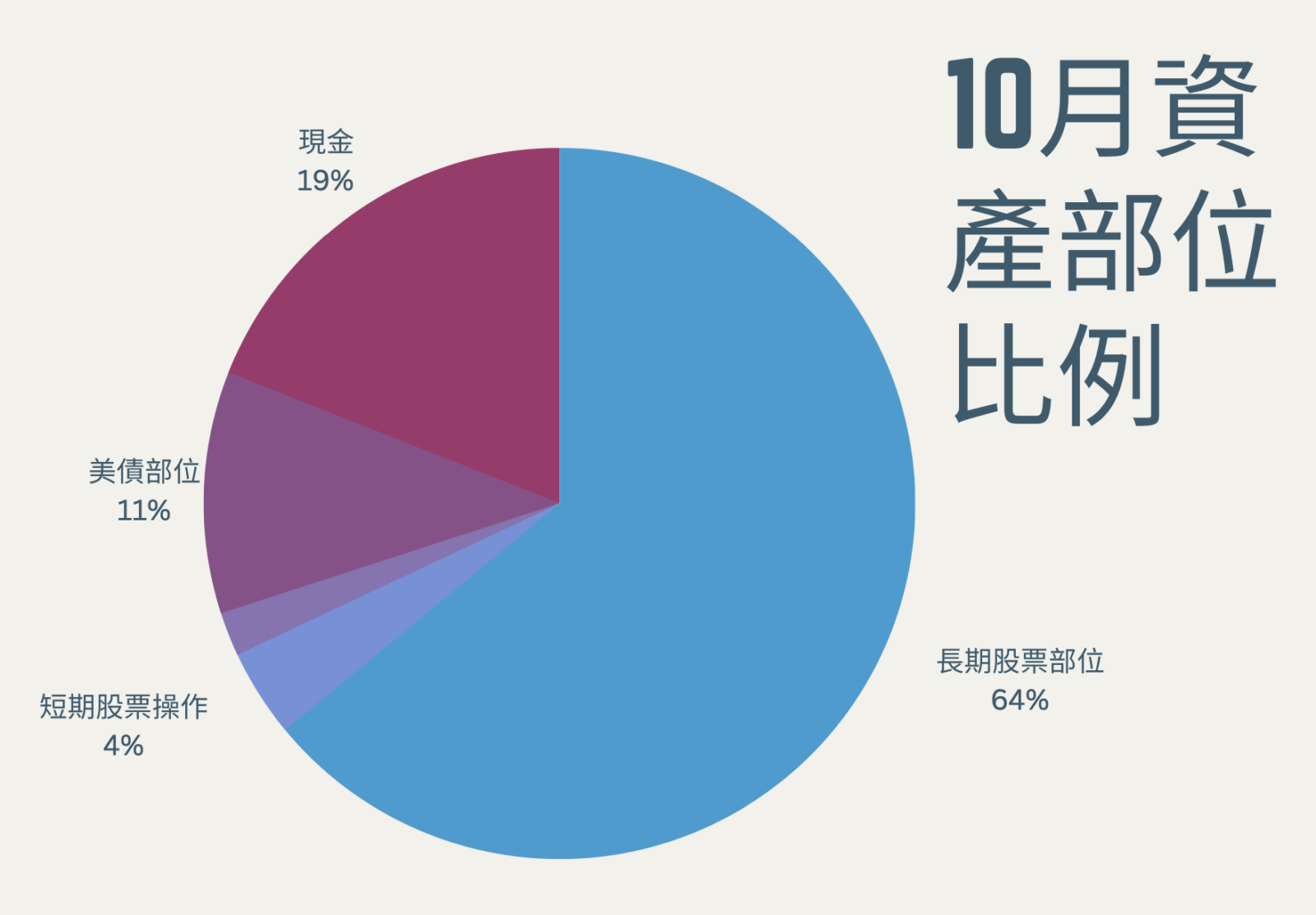 - 在資產水位部分,要跟大家說明的是,由於我統計的是市值權重後的比例,並不一定能準確反映其操作,操作部分還是得根據日誌來做調整,十月份,我的股票部位其實在放大,買的股數變多,但由於十月的資產減損比較明顯,長期股票部位比例,反而從 64% 下滑至 62%。現金其實因為正在抄底而減少,但卻因為其減損幅度小於股債,反而比例上升了 (其中還有美元匯兌收益,因為我是以換算為新台幣作比例統計),目前從九月份的 19% 上揚至 20%。