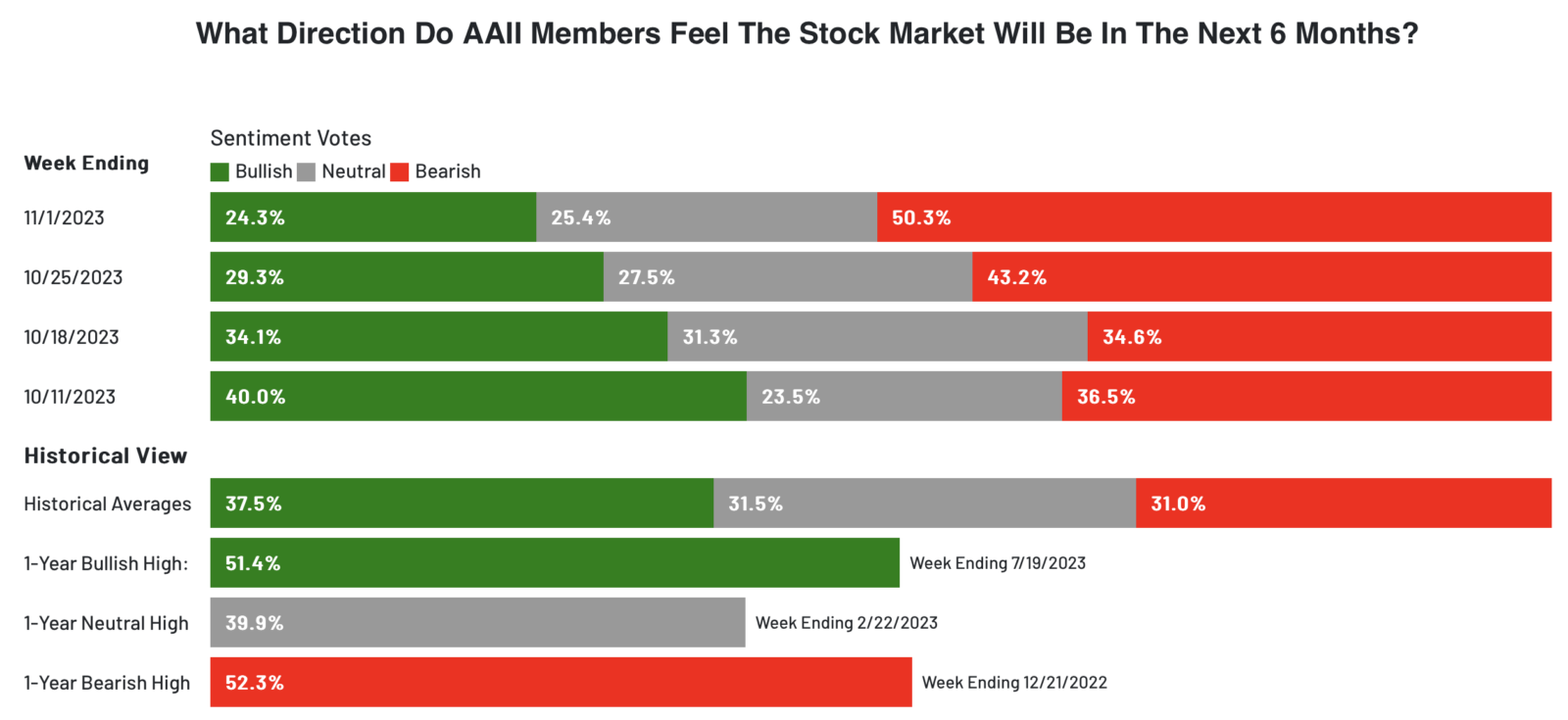 - 這是因為,即便短期內股市大彈,市場情緒並沒有因此轉變為多樂觀,更將其視為死貓跳,以美銀 AAII 散戶情緒指標觀察,目前看多者 (Bullish) 僅 24.3%,創下今年新低,而看空者 (Bearish) 則高達 50.3%,這是歷史最高紀錄,這種狀態說明,過去幾週我在市場極度悲觀、乖離回調時佈建,其實是十分安全的。