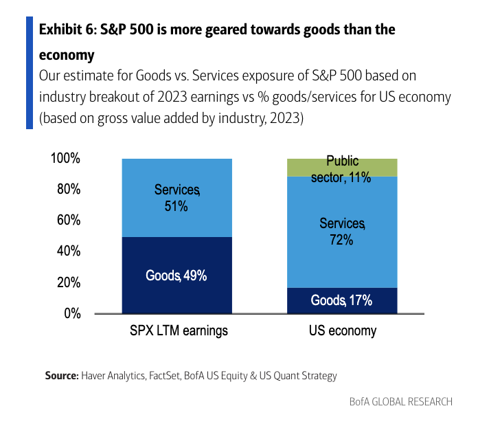 - 最後,許多會員朋友還是會擔心,美國實體經濟似乎不像 AI 行情表現的這麼好,這是因為,目前消費受到高利率的抑制,而製造業則是受到新生產力週期 AI 的拉抬,我們以下圖標普收益來看,有接近一半都是由商品製造業所驅動,然而放大到美國經濟,則由接近七成是由服務驅動,這就導致 AI 對獲利的拉抬,沒辦法直接反映到實體經濟上,因為經濟增長主要還是靠服務業。
