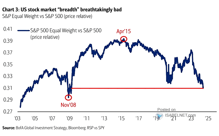 - 以下圖來看,為標普等權指數與標普 500 指數的比值,過去一年是高速向下,代表著美股是由少數科技巨頭拉動指數創下新高,標普的其他科技股都沒有太亮麗的表現。