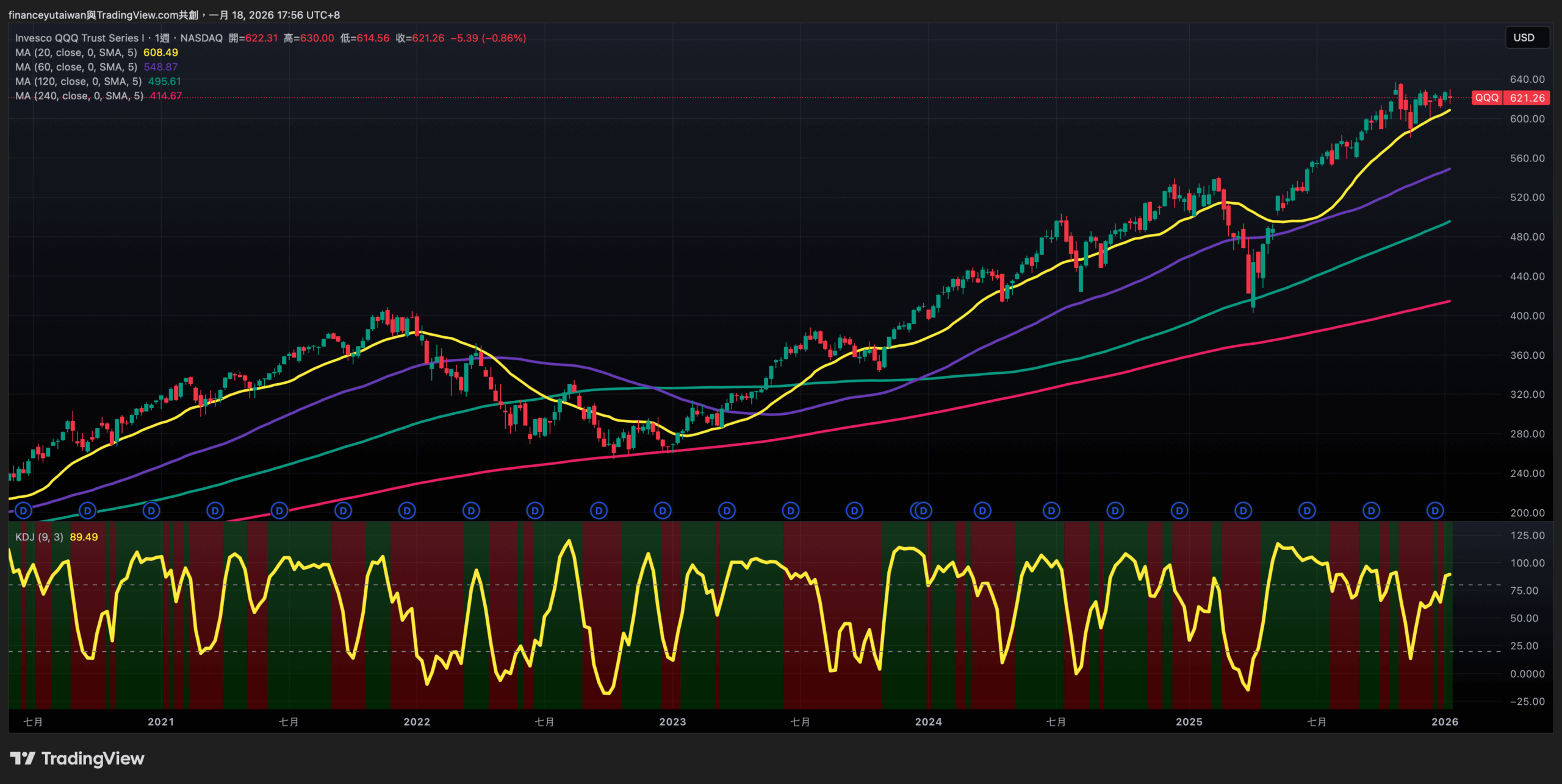 - 不過,如果是我們過去提到,尚未建立足夠股市部位的投資人,那指反而有了機會,雖然 QQQ 的乖離正在走高,但價位其實過去一個季度,沒有太大變動,只要有價格承壓的交易日,仍可以視為優先回補對象。